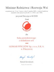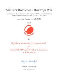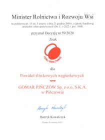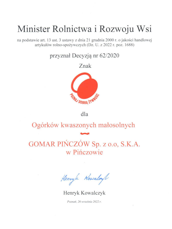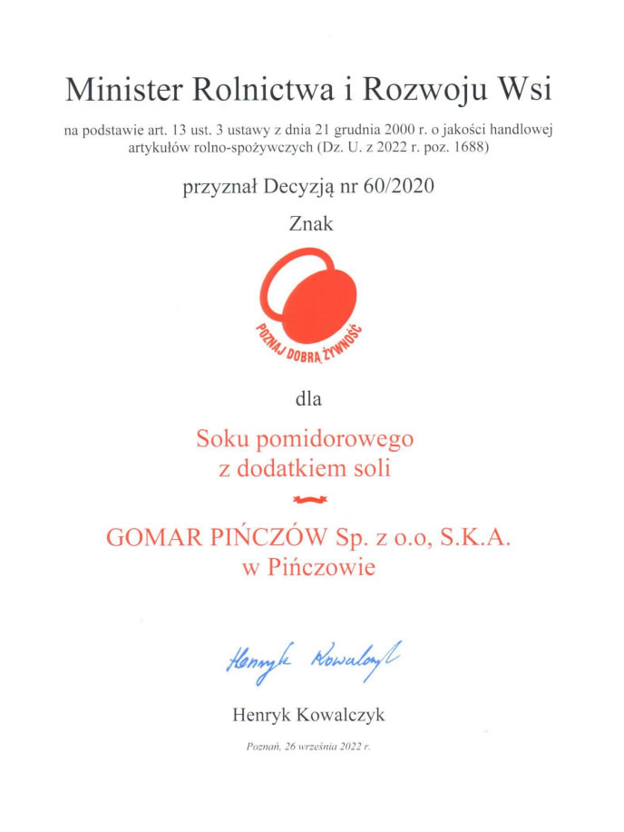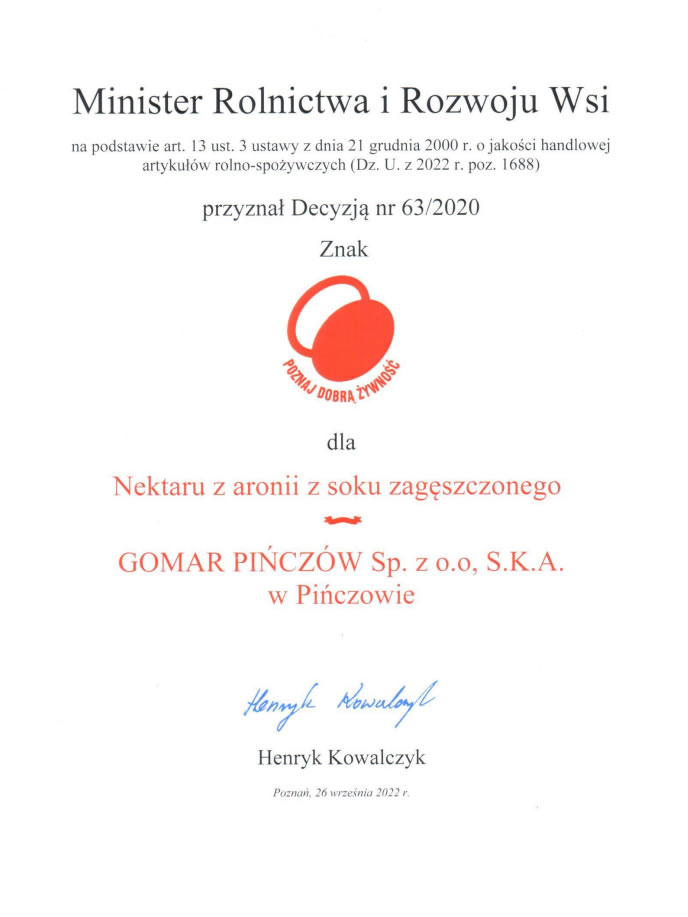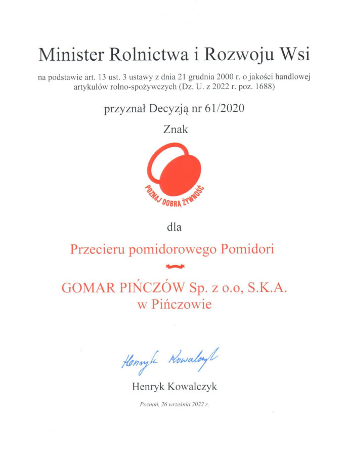 27 września 2022 podczas targów POLAGRA w Poznaniu odbyło się uroczyste wręczenie znaków jakości produktów spożywczych „Poznaj Dobrą Żywność”. Nasze produkty po raz kolejny otrzymały wyróżnienie, które jest przyznawane na 3 lata. Znak poznaj dobrą żywność otrzymały: Nektar z aronii, Powidła śliwkowe, Ogórki kwaszone małosolne, Przecier pomidorowy i Sok ze świeżych pomidorów.